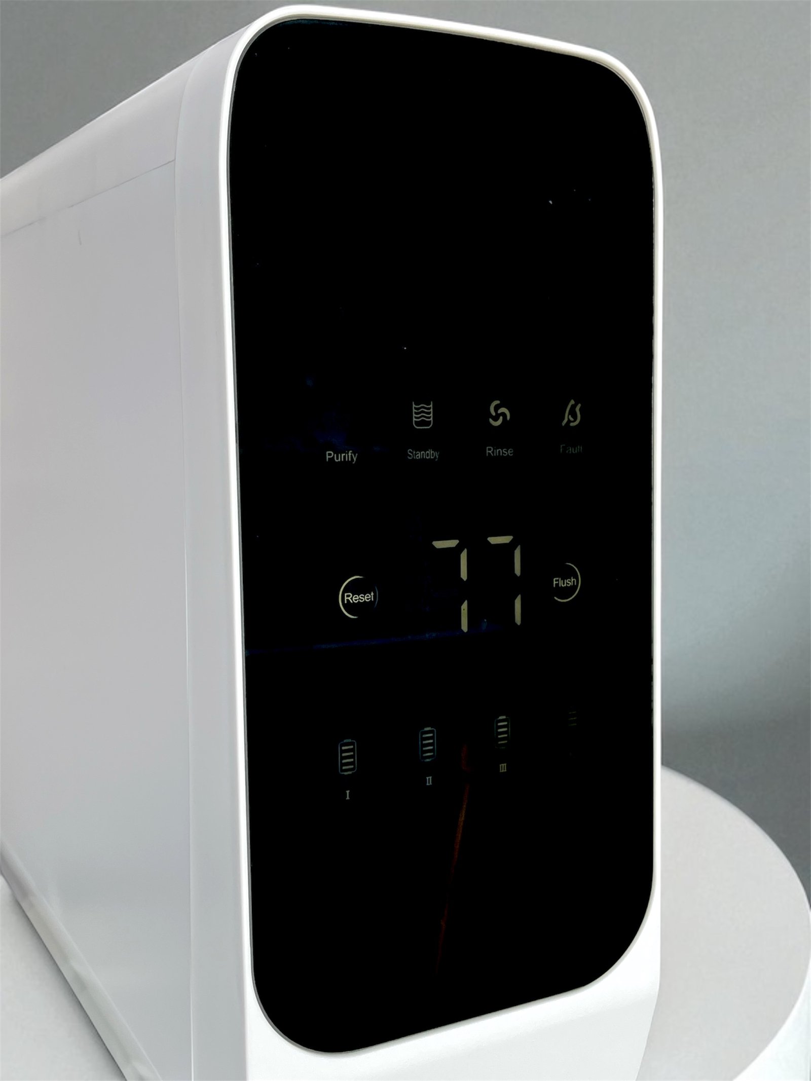 جهاز متطور لتنقية المياه يعمل بتقنية التناضح العكسي (RO) عبر 4 مراحل فلترة، مزود بمؤشرات تشغيل توضح حالة الجهاز، مع أزرار تحكم عملية لسهولة الصيانة والتشغيل.
